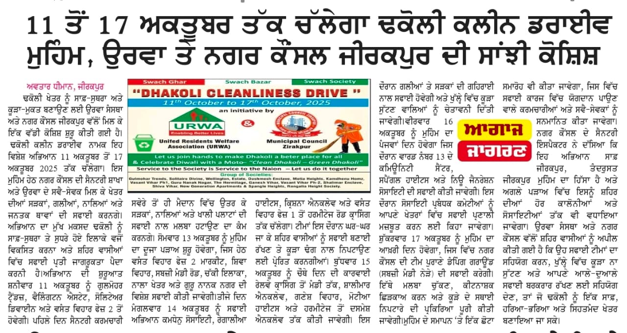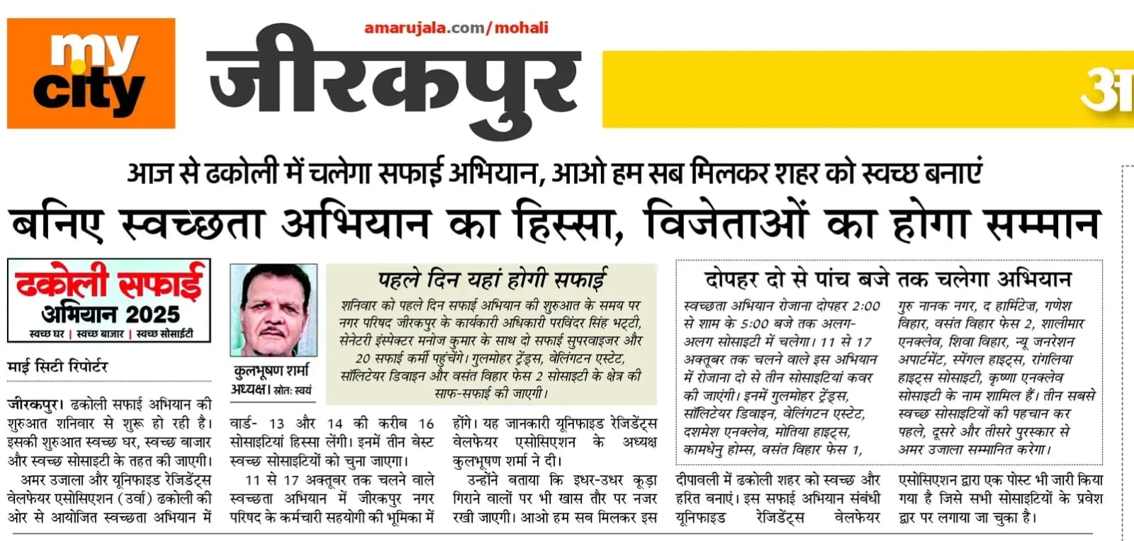 In order to ensure that this Deepawali bring prosperity to all the residents of Dhakoli, URWA has decided to celeberat this week i.e. 11th Oct 2025 to 17th Oct, 2025 as Dhakoli Cleanliness Week with the support of Municipal Council, Zirakpur. Further to enhance this spread and mark maximum participation, various event partners have consented to join this initiative. The following event partners are participating: